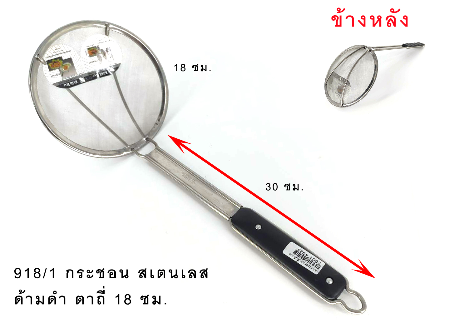 918/1 กระชอนตาถี่ SL ตื้นด้ามดำ18 cm.ขอบลวด